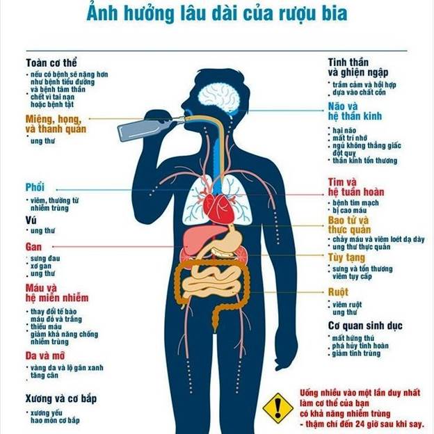 Đáng chú ý, rượu bia còn ảnh hưởng đến hệ tiêu hóa, gây viêm loét dạ dày, viêm tụy cấp và làm suy giảm hệ miễn dịch, khiến cơ thể dễ mắc bệnh hơn.