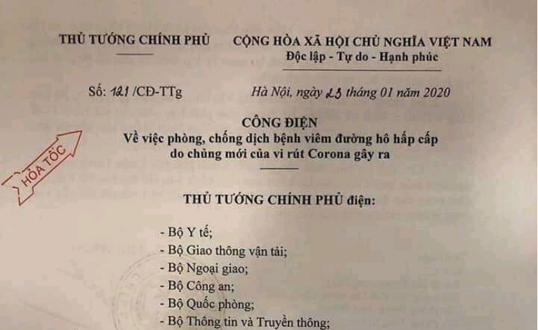Chủ nhật, 26/01/2020 | 19:32 A- A A+ | Công điện số 121/CĐ-TTg ngày 23/01/2020 về việc phòng, chống dịch bệnh viêm đường hô hấp cấp do chủng mới của vi rút Corona gây ra Đọc bài Lưu Nguồn:trungtamytemongcai.vn Copy link Nguồn: http://trungtamytemongcai.vn/index.php?option=com_content&view=article&id=1163:cong-in-s-121c-ttg-ngay-23012020-v-vic-phong-chng-dch-bnh-viem-ng-ho-hp-cp-do-chng-mi-ca-vi-rut-corona-gay-ra&catid=128:viem-phi-cp-coronavirus Tổng số điểm của bài viết là: 0 trong 0 đánh giá Click để đánh giá bài viết