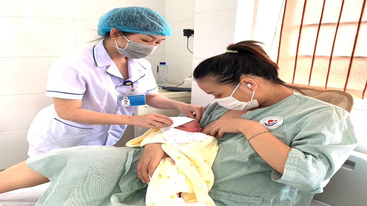 Nữ hộ sinh Khoa CSSKSS-Phụ sản Trung tâm y tế TP Móng Cái hướng dẫn bà mẹ cho con bú ngay sau sinh và chăm sóc trẻ sơ sinh