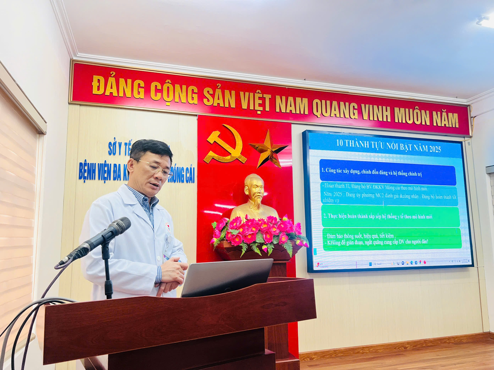 Đánh giá về kết quả đạt được trong năm 2025, Thạc sĩ, Bác sĩ Đoàn Ngọc Thủy – Giám đốc Bệnh viện Đa khoa khu vực Móng Cái ghi nhận và biểu dương tinh thần trách nhiệm, sự nỗ lực, đoàn kết của toàn thể cán bộ, viên chức, người lao động. Đồng chí nhấn mạnh, những kết quả đạt được là tiền đề quan trọng để Bệnh viện tiếp tục đổi mới, nâng cao chất lượng khám chữa bệnh trong thời gian tới.