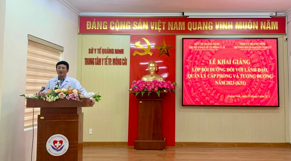 Thay mặt đơn vị, Ths.Bs Đoàn Ngọc Thủy, Giám đốc Trung tâm Y tế thành phố Móng Cái cảm ơn sự quan tâm của Trường đào tạo cán bộ Nguyễn Văn Cừ đã phối hợp tổ chức lớp bồi dưỡng cho đội ngũ cán bộ của đơn vị và nhấn mạnh: khóa học này sẽ trang bị những kiến thức cơ bản về lãnh đạo, quản lý, chỉ đạo, điều hành công tác để góp phần nâng cao kiến thức và kỹ năng quản lý, điều hành công tác của lãnh đạo cấp phòng, đáp ứng yêu cầu phát triển của y tế cơ sở, nhất đội ngũ cán bộ lãnh đạo Trạm y tế xã, phường trong giai đoạn mới. Bên cạnh đó, đồng chí cũng yêu cầu học viên tham gia khóa học với tinh thần và thái độ nghiêm túc, chấp hành tốt nội quy, quy chế lớp học, hoàn thành tốt chương trình, nội dung khóa học đề ra.