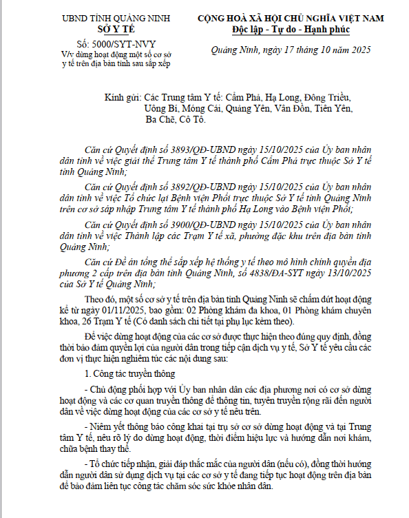 Thông báo số 5000/SYT-NVY V/v dừng hoạt động một số cơ sở y tế trên địa bàn tỉnh sau sắp xếp